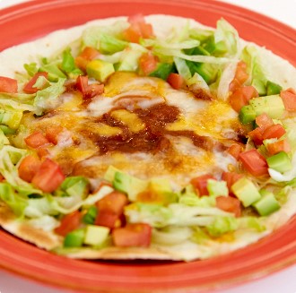 옥수수 또띠야 2장, 시판 미트 소스 4큰 술, 채 썬 상추 적당량, 아보카도(1cm 크기) 적당량, 토마토(1cm 크기) 적당량, 피자 용 치즈 적당량, 타바스코 조금