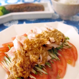 5.그릇에 토마토와 오이를 담고 그 위에 닭 가 슴살을 얹어 마지막에 파 참깨 소스를 곁들인다.